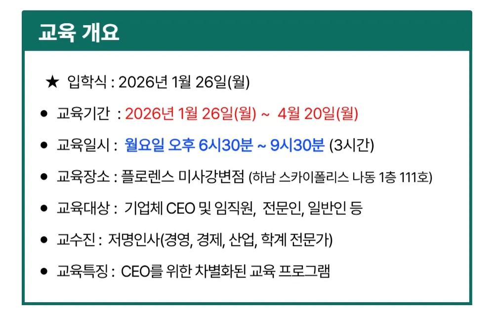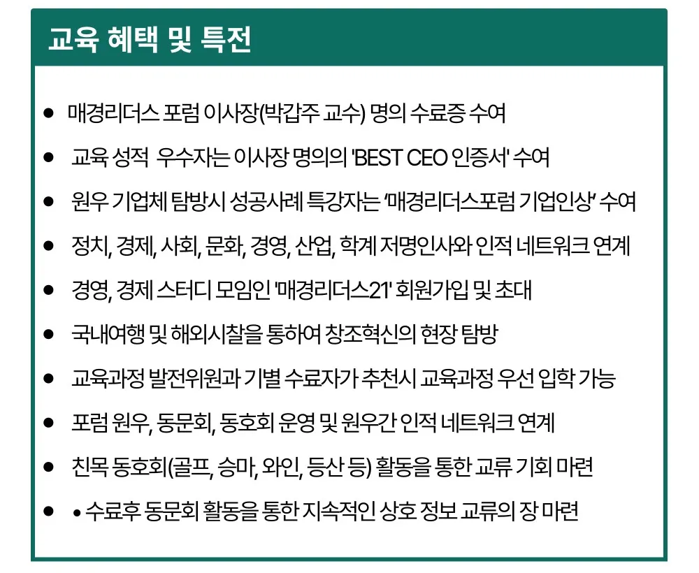 혁신적인 커리큘럼 : 경제 전망부터 혁신 경영, 첨단 IT 기술, 재테크, 부동산 투자, 디지털 트랜스포메이션까지 경영 현장에서 즉시 활용 가능한 인사이트를 제공합니다.