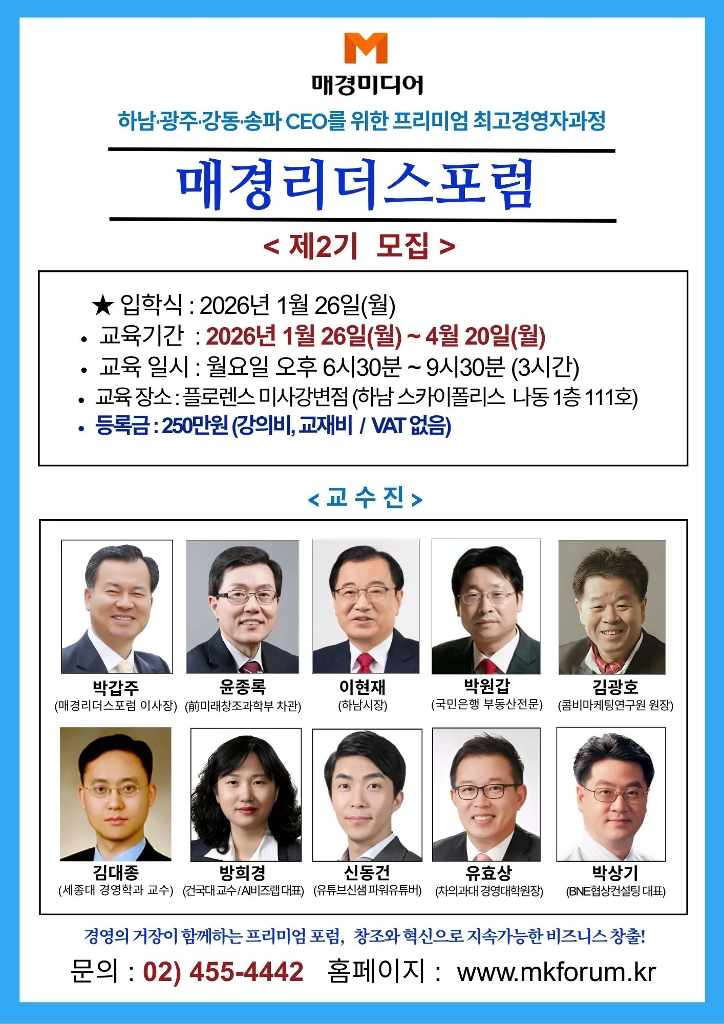비즈니스 환경이 하루가 다르게 변화하는 지금, 진정한 리더에게 필요한 것은 변화의 흐름을 읽고 그 속에서 기회를 포착하는 안목입니다. 매경리더스포럼은 이러한 통찰력과 실행력을 갖춘 리더를 양성하기 위한 차별화된 프리미엄 교육 프로그램입니다.