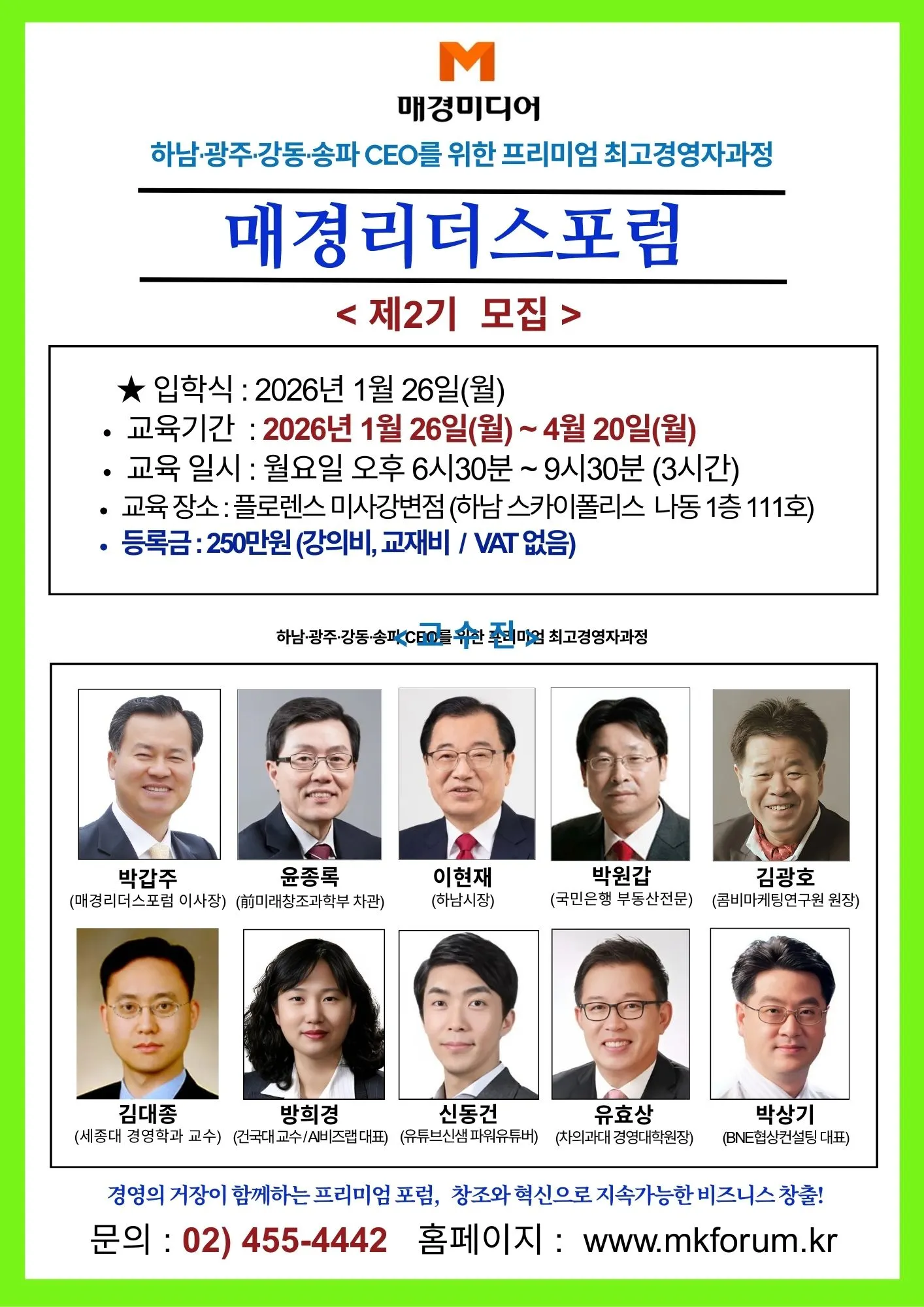 불확실성이 가득한 시대에는 준비된 리더만이 성공할 수 있습니다. 매경리더스포럼은 단순한 교육이 아닌, 여러분의 비즈니스와 삶에 실질적인 변화를 가져올 소중한 기회가 될 것입니다.